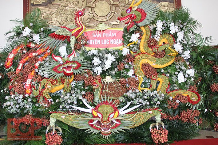 Vải thiều và các loại hoa quả đặc sản của huyện Lục Ngạn được trang trí công phu, tinh xảo