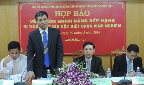 Ngày 9/3/2016, tại Trung tâm Hội nghị tỉnh, UBND tỉnh Bắc Giang tổ chức Họp báo về Lễ đón nhận Bằng xếp hạng Di tích quốc gia đặc biệt Chùa Vĩnh Nghiêm. Đồng chí Lê Ánh Dương, Phó Chủ tịch UBND tỉnh, Trưởng ban tổ chức Lễ đón nhận chủ trì. Cùng dự có các đồng chí Nguyễn Sĩ Cầm, Phó Giám đốc Sở VHTTDL; Ngô Đình Tiến, Phó Giám đốc Sở TTTT; Trương Quang Hải, Phó Chủ tịch UBND huyện Yên Dũng; Thượng tọa Thích Thiện Văn, Trưởng ban trị sự Giáo hội Phật giáo Việt Nam tỉnh Bắc Giang, Trụ trì chùa Vĩnh Nghiêm; đại diện lãnh đạo và phóng viên các cơ quan thông tấn báo chí ở Trung ương và tỉnh Bắc Giang.
