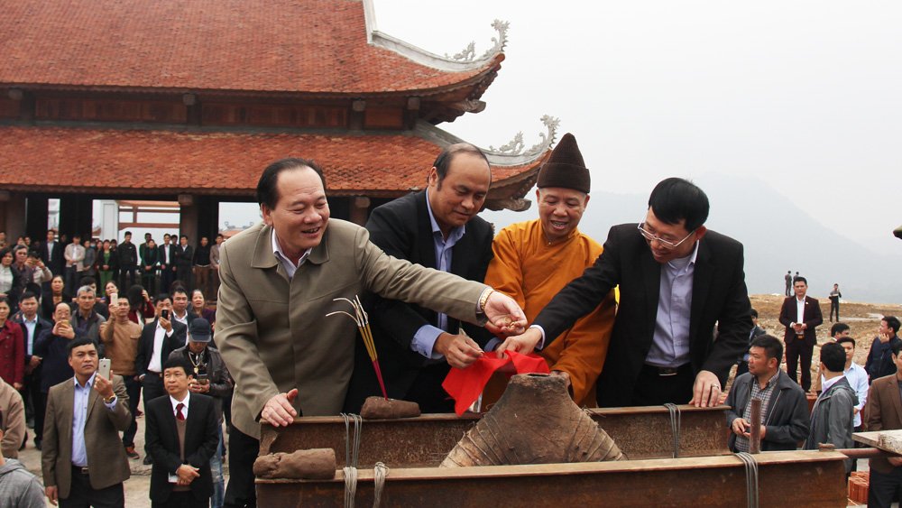 Chủ tịch UBND tỉnh Nguyễn Văn Linh và các đại biểu chuyển vàng, bạc do các tổ chức, cá nhân công đức đưa vào khuôn đúc chuông đồng Dự buổi lễ có các đồng chí: Nguyễn Văn Linh, Phó Bí thư Tỉnh ủy, Chủ tịch UBND tỉnh; Phó Chủ tịch UBND tỉnh Lê Ánh Dương; Thượng tọa Thích Thanh Quyết, Phó Chủ tịch Hội đồng Trị sự Giáo hội Phật giáo Việt Nam; đại diện lãnh đạo một số ban, ngành của tỉnh, huyện Sơn Động, doanh nghiệp và đông đảo nhân dân.