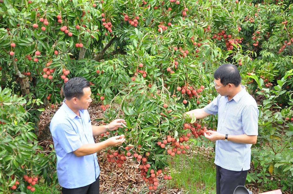 Phó Chủ tịch UBND tỉnh Lê Ánh Dương và các đại biểu khảo sát tại vườn vải thiều thôn Giành Mới, xã Quý Sơn