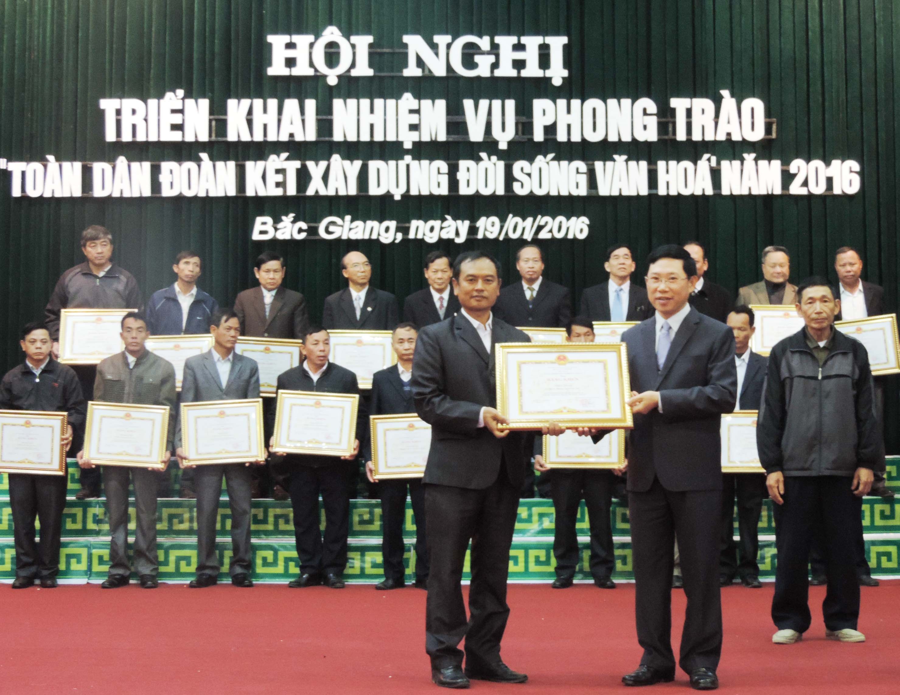 Ngày 19/01/2016, tại thành phố Bắc Giang, Ban chỉ đạo Phong trào “Toàn dân đoàn kết xây dựng đời sống văn hóa” (TDĐKXDĐSVH) tỉnh Bắc Giang tổ chức Hội nghị tổng kết công tác năm 2015, triển khai nhiệm vụ công tác năm 2016. Tham dự có các đồng chí Lương Hữu Thắng, Phó Chánh Văn phòng Thường trực Ban chỉ đạo Trung ương phong trào TDĐKXDĐSVH; Lê Ánh Dương, Phó Chủ tịch UBND tỉnh; Từ Minh Hải, Ủy viên Thường trực HĐND tỉnh; lãnh đạo Văn phòng Tỉnh ủy, Văn phòng UBND tỉnh, Văn phòng Đoàn đại biểu Quốc hội - HĐND tỉnh; các đồng chí thành viên Ban chỉ đạo phong trào TDĐKXDĐSVH tỉnh và các huyện, thành phố. Đồng chí Lê Ánh Dương, Phó Chủ tịch UBND tỉnh phát biểu tại Hội nghị