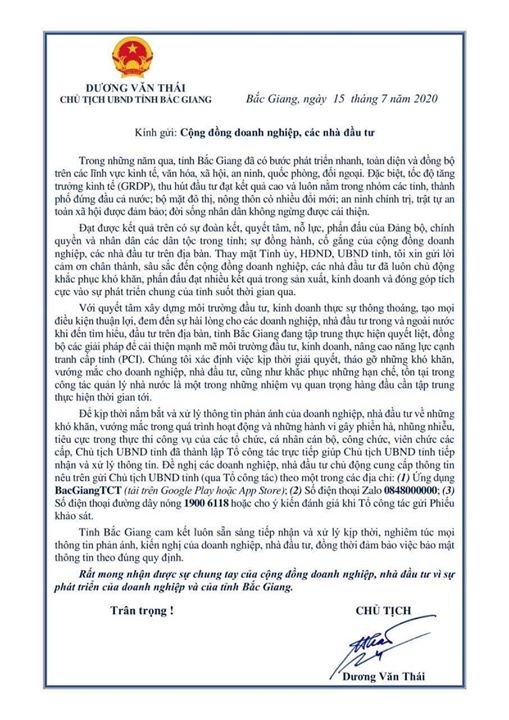 Chủ tịch UBND tỉnh Bắc Giang gửi thư ngỏ đến các nhà đầu tư