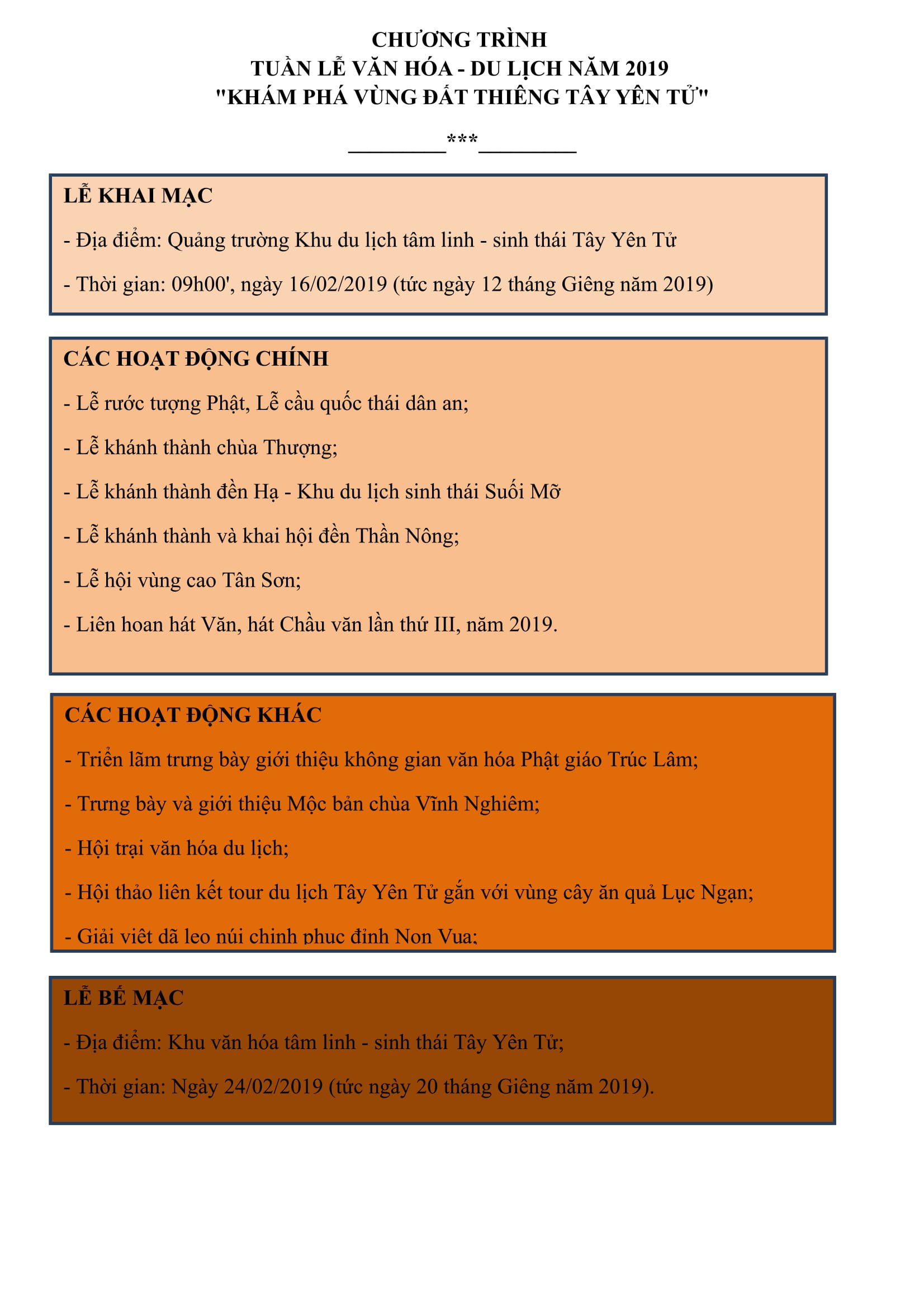 Ngày 15/02/2019 (tức ngày 11 tháng Giêng, thứ 6) tổ chức Lễ khánh thành chùa Thượng; Khai mạc Hội trại văn hóa du lịch; Tổng kết, trao giải cuộc thi ảnh “Bắc Giang quê hương tôi” và phát động tuần thi ảnh đẹp “Khám phá vùng đất thiêng Tây Yên Tử lần thứ I năm 2019"; trưng bày ảnh đẹp “Bắc Giang quê hương tôi” qua các cuộc thi năm 2017, 2018; tổ chức Giải vô địch đẩy gậy tỉnh Bắc Giang năm 2019; biểu diễn nghệ thuật buổi tối tại Khu du lịch tâm linh - sinh thái Tây Yên Tử.