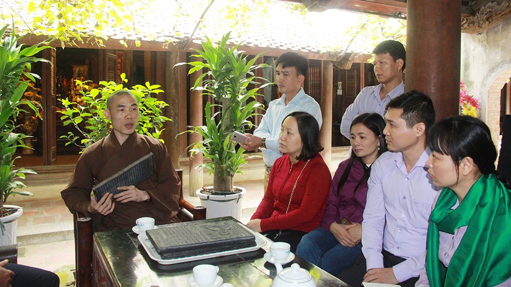 Du khách nghe giới thiệu về mộc bản chùa Vĩnh Nghiêm (Yên Dũng). Nhiều người đi lễ, vãn cảnh