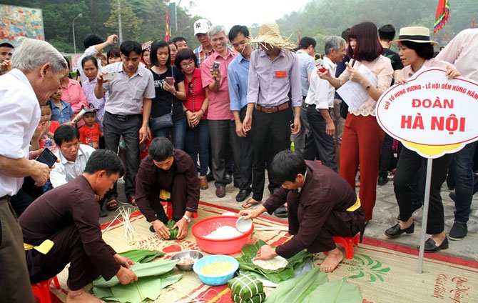Người dân xã Tân Ước, huyện Thanh Oai (Hà Nội) thi gói bánh chưng tại Lễ hội Đền Hùng