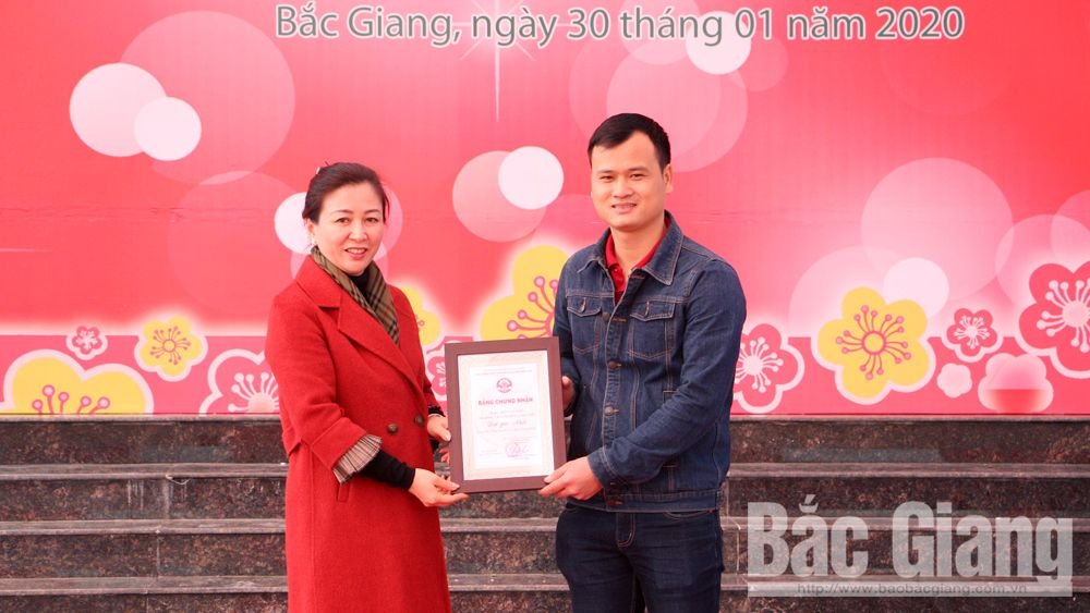 Đồng chí Lê Thị Thu Hồng - Phó bí thư thường trực tỉnh uỷ trao Giấy chứng nhận giải nhất cuộc thi "Ảnh đẹp du lịch Bắc Giang năm 2019" cho tác giả Trần Văn Tuấn ( Yên Dũng)
