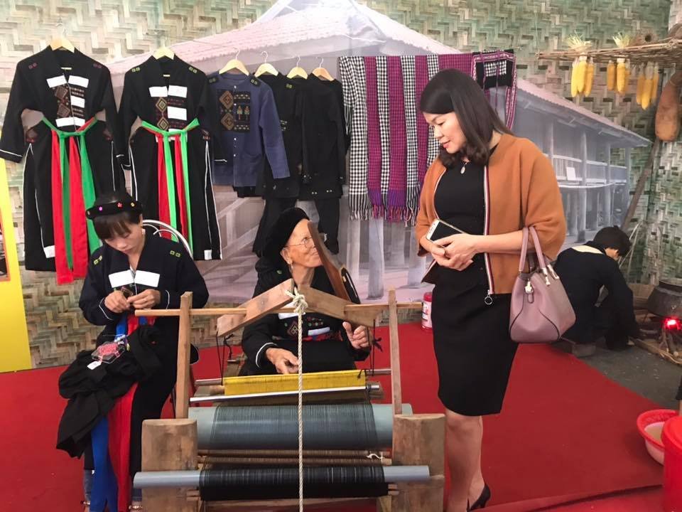 Nghệ nhân trình diễn dệt thổ cẩm và thêu hoa văn trên trang phục của dân tộc Cao Lan