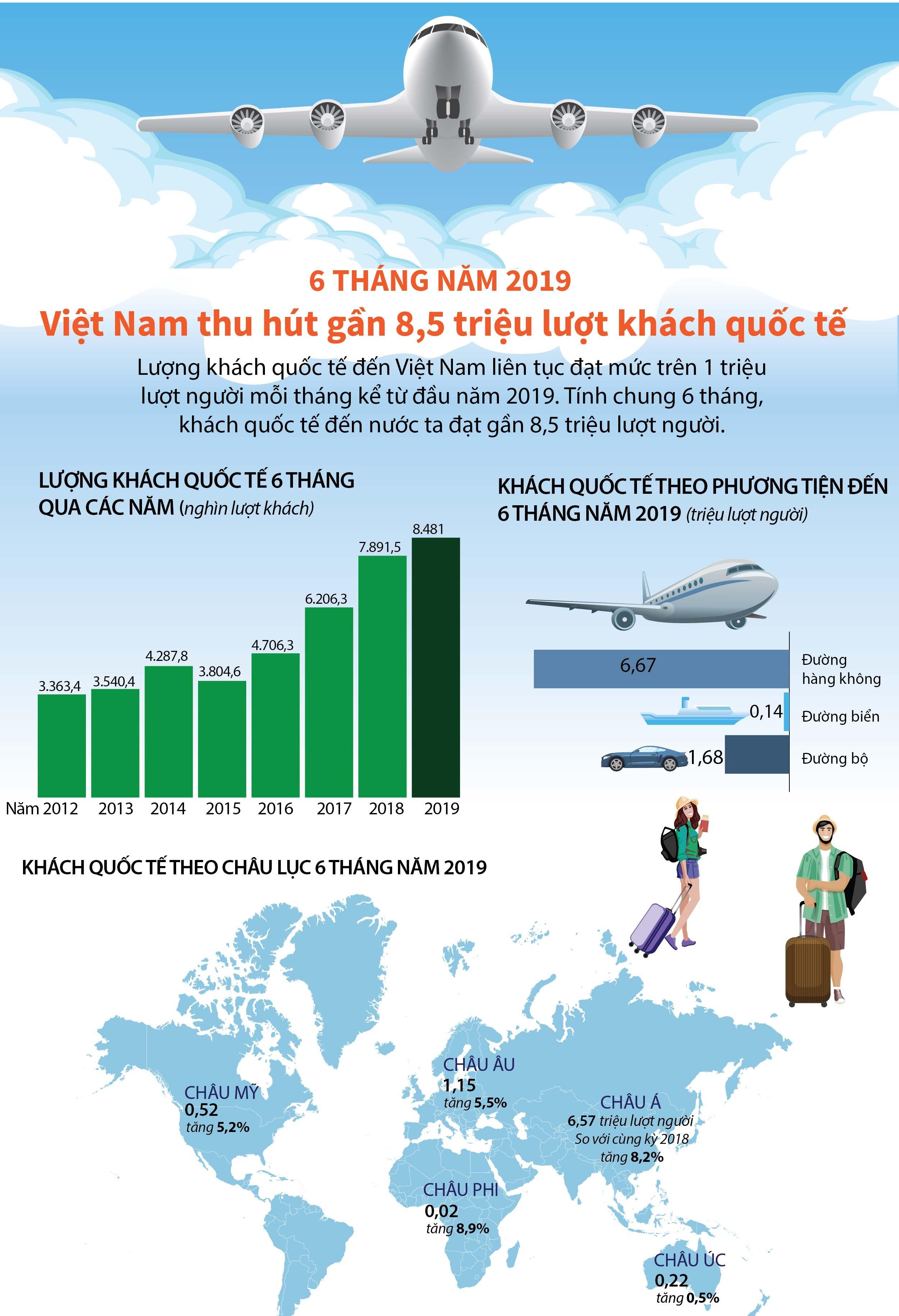 Theo Tổng cục Thống kê, tính chung 6 tháng, khách quốc tế đến nước ta đạt gần 8,5 triệu lượt người, tăng 7,5% so với cùng kỳ năm trước.