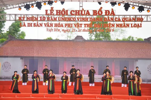 Bên cạnh những giá trị tiêu biểu của chùa Bổ Đà thì Bắc Giang nói chung và Việt Yên nói riêng có Dân ca Quan họ được UNESCO công nhận là di sản văn hóa phi vật thể của nhân loại. Năm 1971, Việt Yên có 5 làng quan họ cổ trong tổng số 49 làng quan họ được công nhận đó là: Hữu Nghi, Nội Ninh, Mai Vũ, Giá Sơn, Sen Hồ. Đến năm 2009 huyện có thêm 13 làng quan họ được UNESCO công nhận là: Thổ Hà, Thần Trúc, Hạ Lát, Thượng Lát, Khả Lý Thượng…đến nay, toàn huyện có 42 câu lạc bộ quan họ và 120 làng quan họ thực hành.