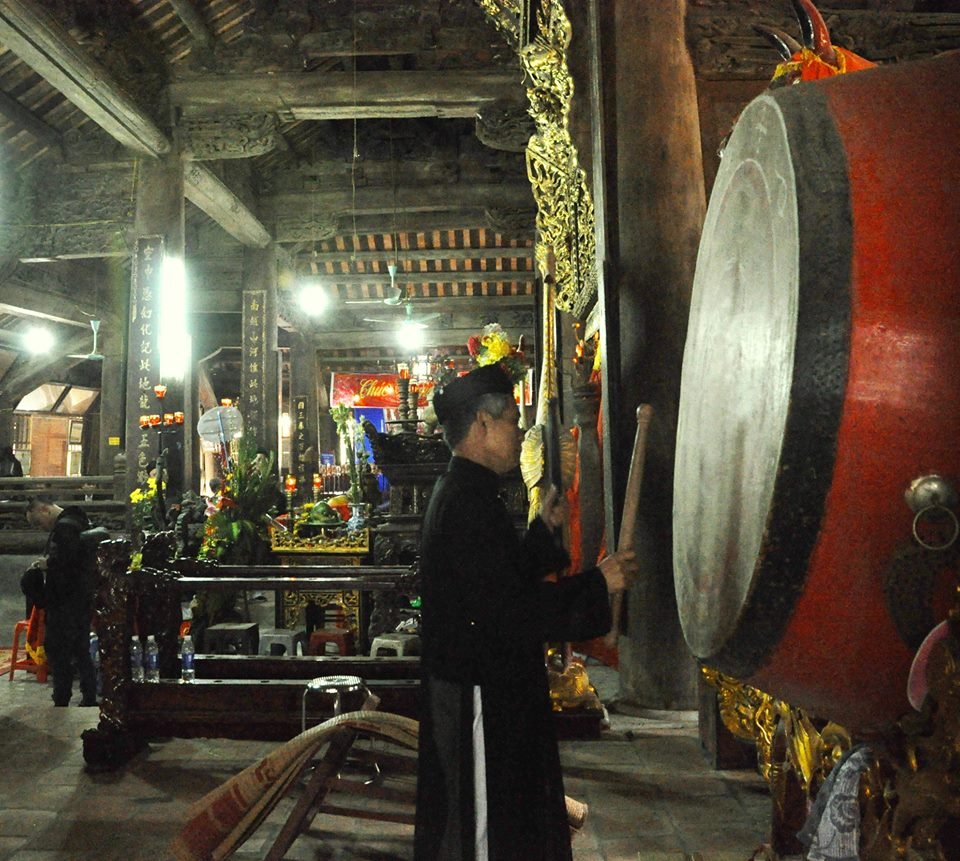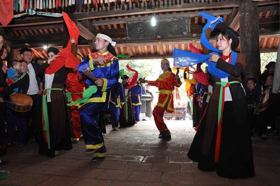 Diểm trong hội. Ảnh: Lý Học Mỗi năm lễ hội diễn ra một lần nhưng hai năm mới tổ chức lễ rước và được luân phiên giữa 4 xóm trong thôn. Năm nay, xóm 2 chịu trách nhiệm tổ chức lễ rước từ điếm về đình làng. Để hoàn thành nhiệm vụ, cả xóm chuẩn bị từ nhiều tháng trước, những người tham gia lễ rước được chọn rất kỹ tham gia đóng các vai chính trong đám rước và tổ chức tập luyện như: Tổng cờ, tổng kiếm, người mang gươm trường, tam đa, kim đồng, ngọc nữ; bầu chọn chủ tế, ban tế, kế đó là cắt cử người vào các chân phù giá, vác cờ, khiêng kiệu, hương án, chấp kích, bát biểu, đội múa kỳ lân, đánh chiêng, trống tiên, trống rồng, múa sinh tiền, nhạc bát âm… Lễ hội diễn ra các hoạt động hấp dẫn như: Hát quan họ trên sông Cầu, diễn tuồng, tổ tôm điếm, chọi gà, các môn thể thao và nhiều trò chơi dân gian, viết thư pháp.