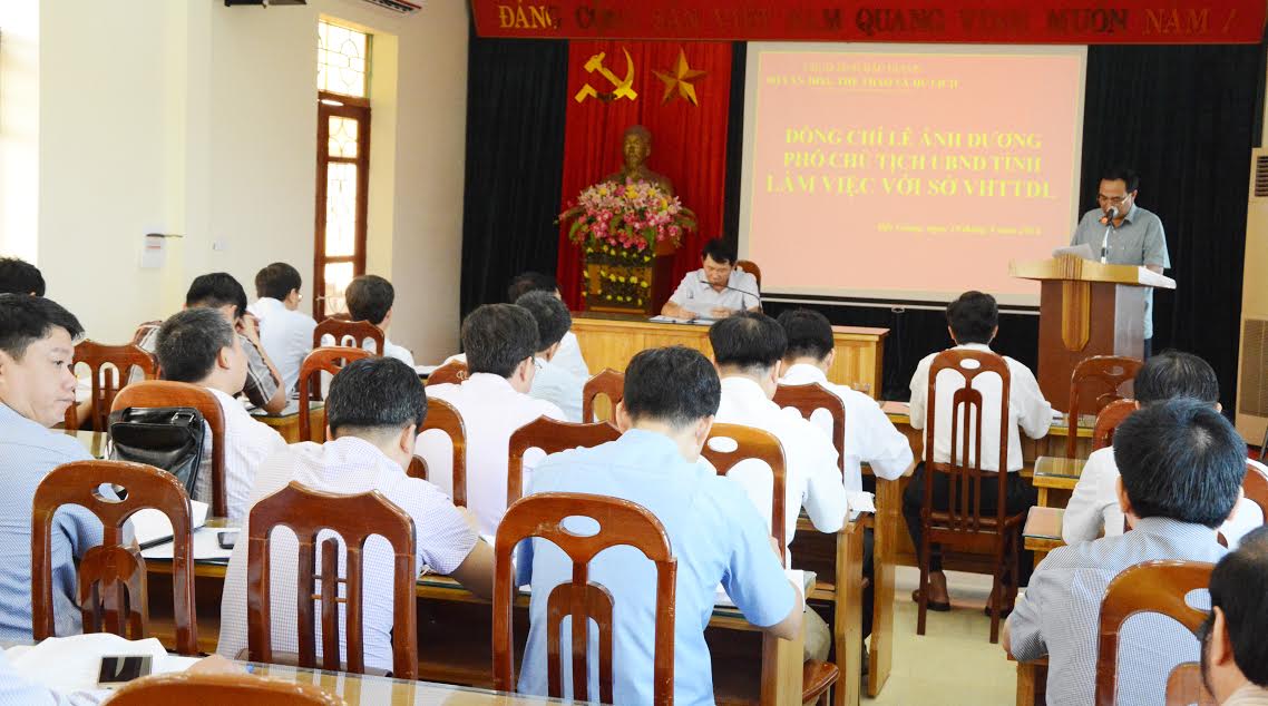 Sáng ngày 19/9/2016, Phó Chủ tịch UBND tỉnh Lê Ánh Dương có buổi làm việc với Sở VHTTDL. Cùng tham gia buổi làm việc có lãnh đạo các Sở: Nội vụ, Kế hoạch – Đầu tư, Tài chính; Giám đốc, các Phó Giám đốc Sở VHTTDL; lãnh đạo các phòng, đơn vị trực thuộc Sở VHTTDL.
