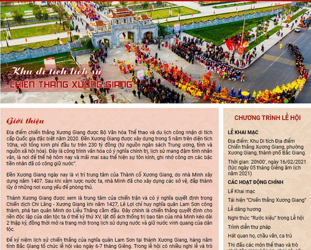 Năm 2019 Địa điểm Chiến thắng Xương Giang được Thủ tướng Chính phủ quyết định xếp hạng là Di tích Quốc gia đặc biệt. Năm 2020, UBND tỉnh Bắc Giang quyết định công nhận khu di tích là điểm du lịch. Nơi đây mỗi năm thu hút khoảng 40 nghìn lượt du khách, trong đó đón nhiều lượt khách quốc tế. Đền Xương Giang cũng là nơi tổ chức hoạt động ngoại khóa cho học sinh, sinh viên trong và ngoài tỉnh đến tham quan, dâng hương, tìm hiểu lịch sử địa phương./.