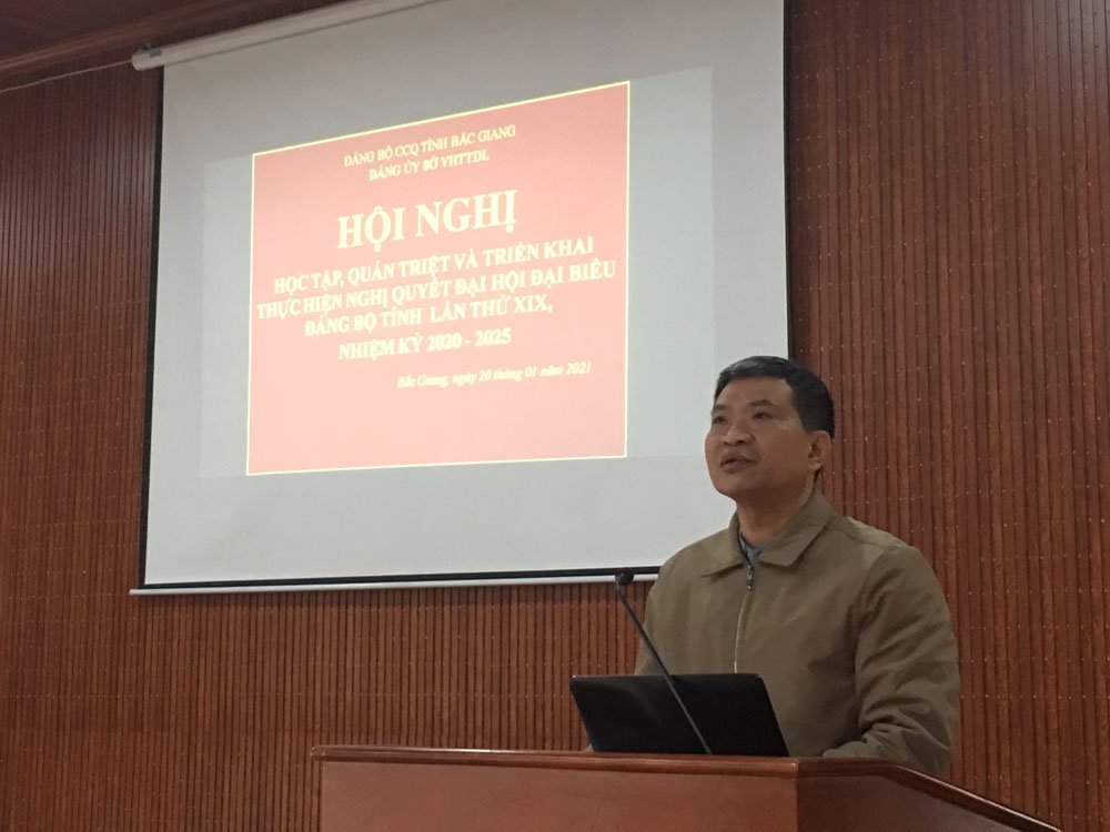 Ngày 20/01, Đảng uỷ Sở Văn hoá, Thể thao và Du lịch Bắc Giang đã tổ chức Hội nghị học tập, quán triệt, triển khai thực hiện Nghị quyết Đại hội Đại biểu Đảng bộ tỉnh Bắc Giang lần thứ XIX nhiệm kỳ 2020 - 2025 với sự tham gia của toàn thể Đảng viên, cán bộ công chức, viên chức trong toàn ngành. Đồng chí Nguyễn Sĩ Cầm, Phó Bí thư Đảng ủy, Phó Giám đốc Sở VHTTDL phát biểu tại Hội nghị.