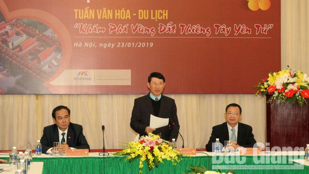 Ngày 23-1, tại Hà Nội, UBND tỉnh Bắc Giang tổ chức họp báo về Tuần Văn hóa- Du lịch với chủ đề “Khám phá vùng đất thiêng Tây Yên Tử” dịp Xuân Kỷ Hợi 2019. Phó Chủ tịch UBND tỉnh Lê Ánh Dương chủ trì. Tham dự có lãnh đạo một số ban, ngành, địa phương và nhiều cơ quan báo chí Trung ương, địa phương.
